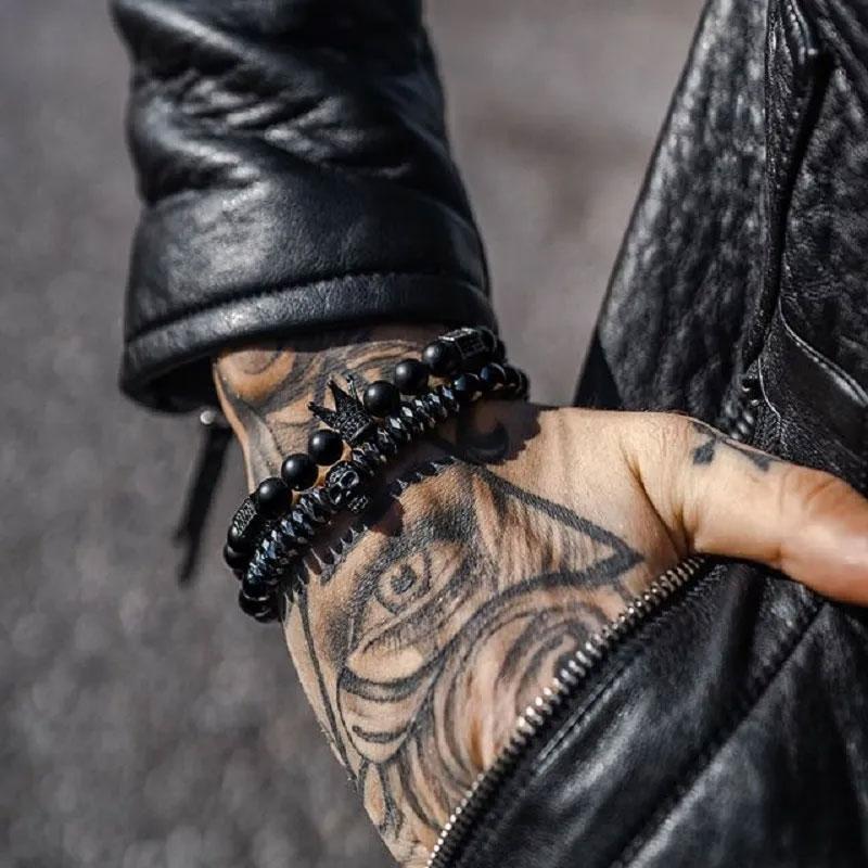 Браслет чоловічий з натуральних каменів COMMANDER чорний з черепом і короною